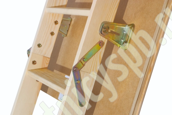 Деревянная чердачная лестница LWS изготовлена из древесины сосны и укомплектована утепленной крышкой, облицованной ДВП бежевого цвета (толщина крышки люка с утеплителем – 36 мм). Крышка люка крепится металлическими шарнирами, которые позволяют регулировать длину лестницы (макс. 40 мм). Для транспортировки лестница снижается в пазах, перед использованием необходимо отодвинуть лестничный марш от плиты люка.