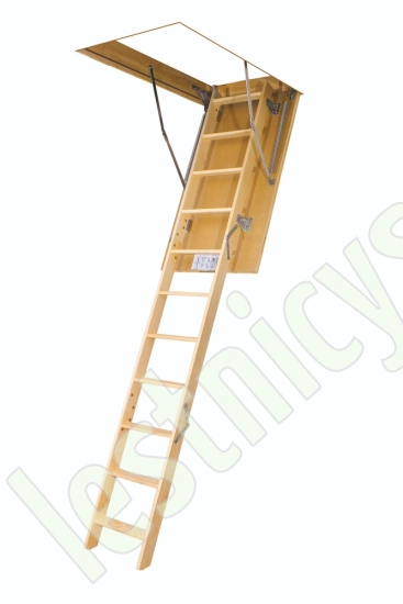 Деревянная чердачная лестница LWS изготовлена из древесины сосны и укомплектована утепленной крышкой, облицованной ДВП бежевого цвета (толщина крышки люка с утеплителем – 36 мм). Крышка люка крепится металлическими шарнирами, которые позволяют регулировать длину лестницы (макс. 40 мм). Для транспортировки лестница снижается в пазах, перед использованием необходимо отодвинуть лестничный марш от плиты люка.