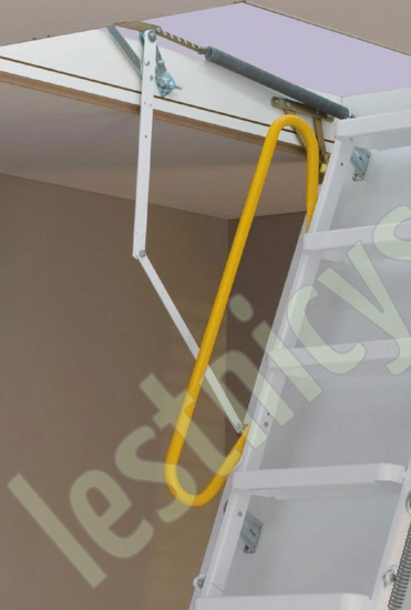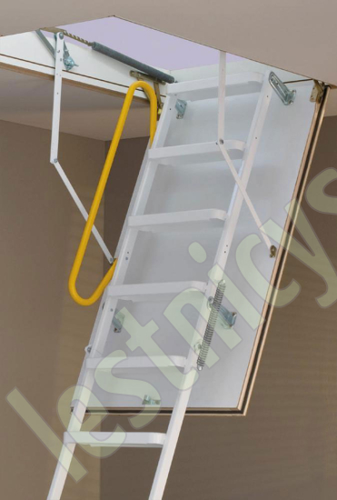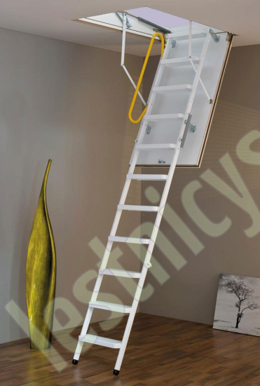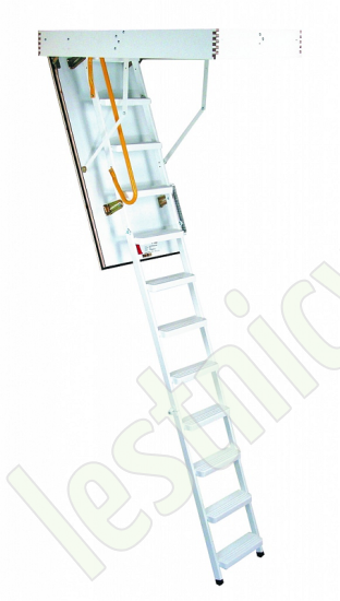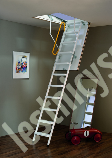 Износоустойчивая лестница для холодных помещений, приспособлена, как для частого использования так и для продолжительного простаивания. Белый цвет крышки люка (толщина 3,3 см) гармонично интегрируется в интерьер помещения и закрывается, маскируясь в один уровень с потолком.