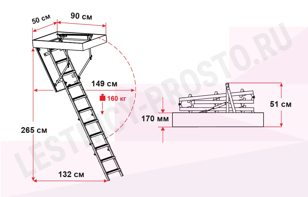 Складная 4-х секционная чердачная лестница. Ступени выполнены из сосны, имеют противоскользящие насечки, направляющие из металла.