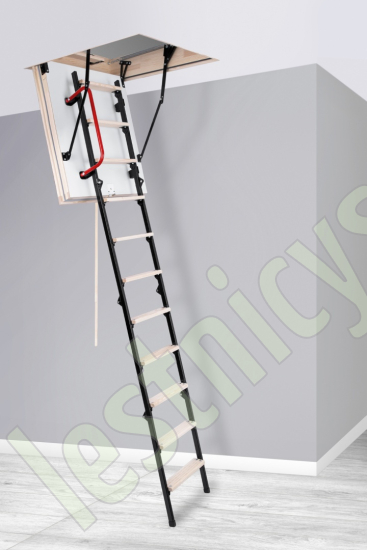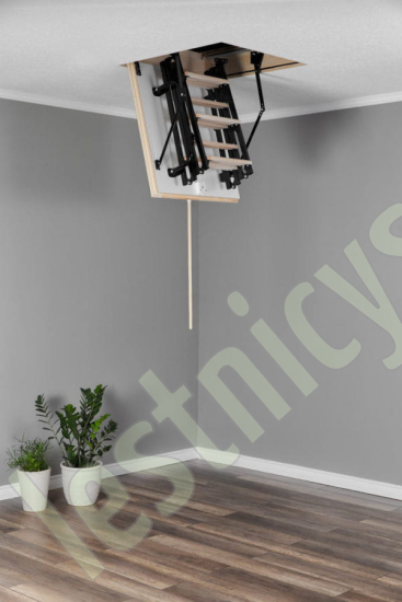 Складная 4-х секционная чердачная лестница. Ступени выполнены из сосны, имеют противоскользящие насечки, направляющие из металла.