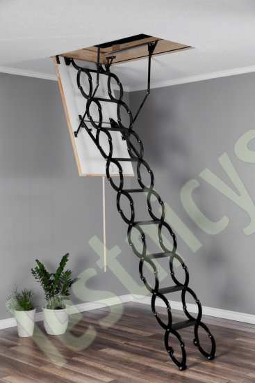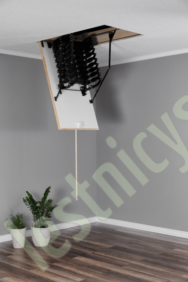 Чердачная лестница NOZYCOWE TERMO отличается одинарным контуром уплотнения крышки люка, она идеально подходит для условий, когда чердак утеплен и не требует дополнительной теплоизоляции. Термоизоляционная крышка типа "сэндвич" облицована с двух сторон ДСП белого цвета. Конструкция лестницы изготовлена из анодированной стали. Можно увеличить высоту лестницы с помощью дополнительных секций. Одна секция позволяет увеличить высоту на 25 см, возможна установка не более 2 доп.секций (покупаются отдельно).