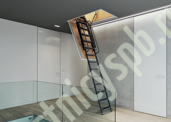 Лестница чердачная складная металлическая 3-х секционная. Ступени полностью выполнены из металла и покрашены порошковой краской. Лестница имеет 2 короба и 2 крышки люка. Нижняя крышка лестницы представляет собой многослойную конструкцию – деревянная рама, внутри которой находится теплоизоляция и противопожарная вставка. Внутренняя часть крышки покрыта оцинкованной жестью, наружная часть белой эмалью и защитной пленкой. Толщина крышки 60мм. Верхний люк выполнен из влагостойкой фанеры и обработан антигрибковым средством. Короб металлический высотой 140мм по периметру проходит уплотнитель. Все соединяющие части изготовлены из твердого материала и имеют оцинкованное покрытие.