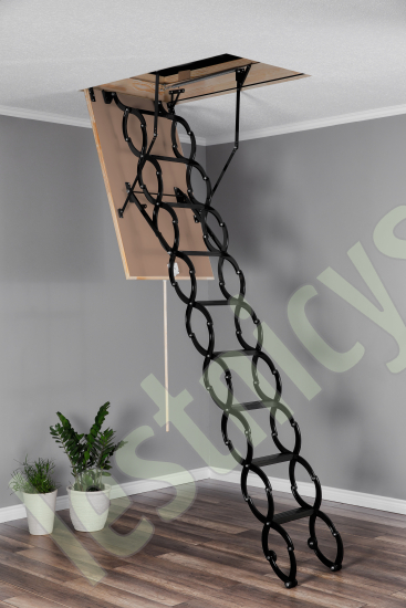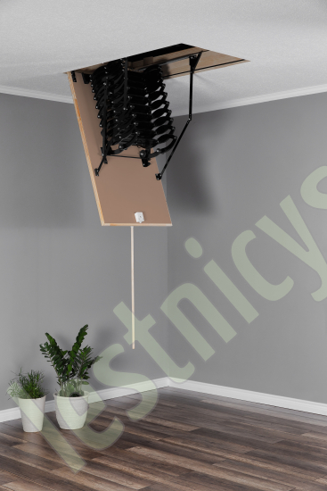 Лестница чердачная раздвижная ножничного типа, работает по принципу сжатия. Термоизоляционная крышка типа“сэндвич “, толщиной 26мм, утеплена пенопластом , облицована с двух сторон ДВП древесного цвета. Лестница предназначена для условий, когда чердак утеплен и не требует дополнительной теплоизоляции. Короб деревянный высотой 140мм. по периметру проходит уплотнитель.