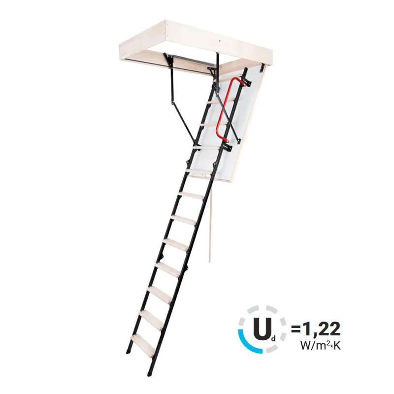 Лестница складная трехсекционная. Рабочая поверхность полностью выполнена из металла и покрашена порошковой краской. Термоизоляционная крышка типа "сэндвич", толщиной 47 мм, утеплена пенопластом, облицована с двух сторон ДCП белого цвета.