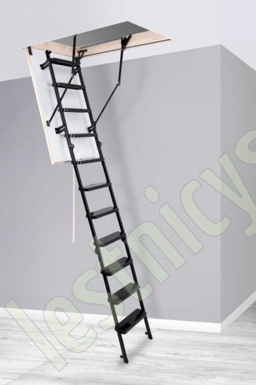 Лестница складная трехсекционная. Рабочая поверхность полностью выполнена из металла и покрашена порошковой краской. Термоизоляционная крышка типа "сэндвич", толщиной 30 мм, утеплена пенопластом, облицована с двух сторон ДCП белого цвета.
