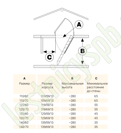 Возможна установка лестницы в разных по высоте помещениях, в пределах от 220 до 280 см.