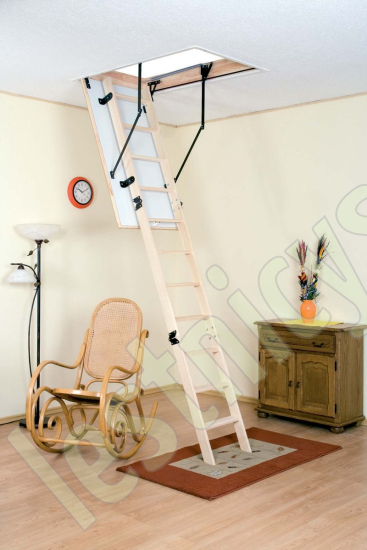 Лестница складная трёхсекционная, изготовлена из сосны. Термоизоляционная крышка типа "сэндвич" утеплена пенопластом, облицована с двух сторон ДСП белого цвета. Короб люка с однослойным уплотнителем. Все металлические элементы лестницы покрыты порошковой краской, ступени лестницы имеют антискользящие насечки и закреплены в столярное соединение «ласточкин хвост», что позволяет выдерживать нагрузку до 150 кг. Деревянный стержень для открывания лестницы в комплекте.
