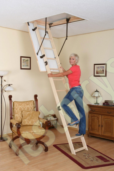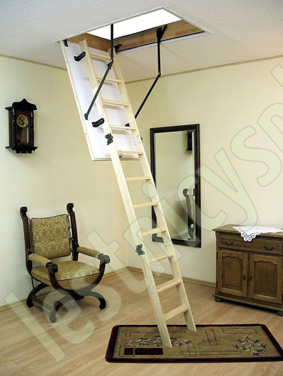 Лестница складная трёхсекционная, изготовлена из сосны. Термоизоляционная крышка типа "сэндвич" утеплена пенопластом, облицована с двух сторон ДСП белого цвета. Короб люка с однослойным уплотнителем. Все металлические элементы лестницы покрыты порошковой краской, ступени лестницы имеют антискользящие насечки и закреплены в столярное соединение «ласточкин хвост», что позволяет выдерживать нагрузку до 150 кг. Деревянный стержень для открывания лестницы в комплекте.