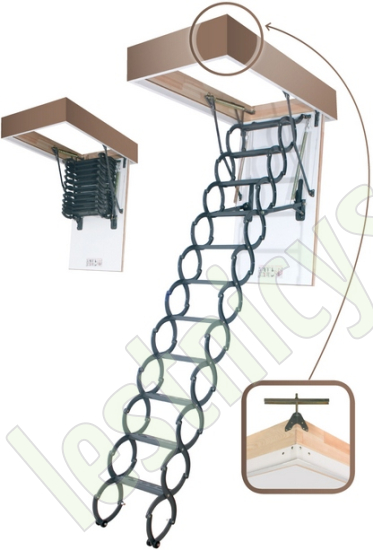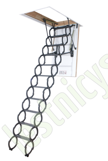 Металлическая чердачная лестница LST оснащена энергосберегающей термоизоляционной крышкой люка белого цвета. По периметру люка установлен контур уплотнения, обеспечивающий высокую степень герметичности. Благодаря «ножничной» системе складывания в сложенном виде лестница очень компактна и имеет небольшой размер крышки люка. S-образные боковые элементы лестницы выполняют роль поручней и придают лестнице современный вид.