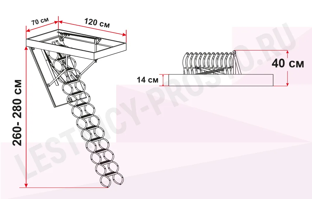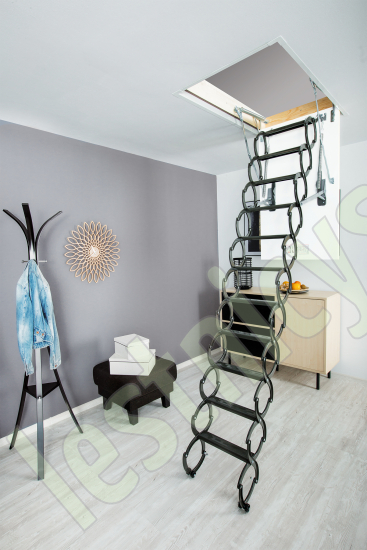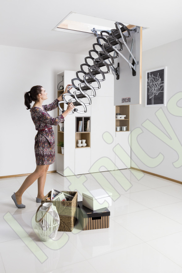 Металлическая чердачная лестница LST оснащена энергосберегающей термоизоляционной крышкой люка белого цвета. По периметру люка установлен контур уплотнения, обеспечивающий высокую степень герметичности. Благодаря «ножничной» системе складывания в сложенном виде лестница очень компактна и имеет небольшой размер крышки люка. S-образные боковые элементы лестницы выполняют роль поручней и придают лестнице современный вид.
