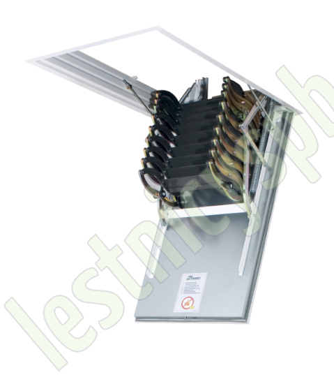 Благодаря «ножничной» системе складывания в сложенном виде лестница LSF очень компактна, и соответственно имеет небольшой размер крышки люка. Специальный механизм регулировки угла открывания крышки люка позволяет подогнать высоту лестницы под высоту потолка.