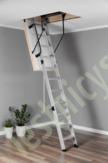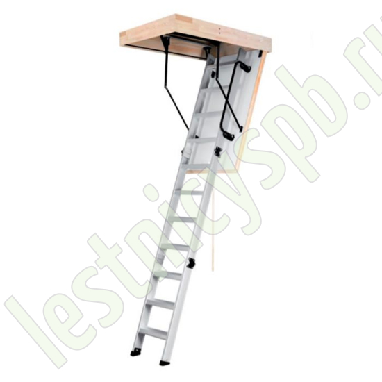 Складная 4-х секционная чердачная лестница. Рабочая поверхность полностью выполнена из алюминия. Термоизоляционная крышка типа "сэндвич" имеет усиленную теплозащиту, облицована с двух сторон ДВП белого цвета. По контуру короба имеется уплотнитель; Все металлические элементы лестницы покрыты порошковой краской.