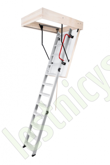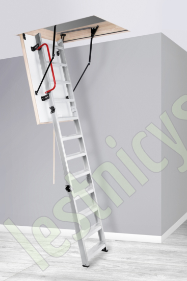 Складная 4-х секционная чердачная лестница. Рабочая поверхность полностью выполнена из алюминия. Термоизоляционная крышка типа "сэндвич" имеет усиленную теплозащиту, облицована с двух сторон ДВП белого цвета. По контуру короба имеется уплотнитель; Все металлические элементы лестницы покрыты порошковой краской.