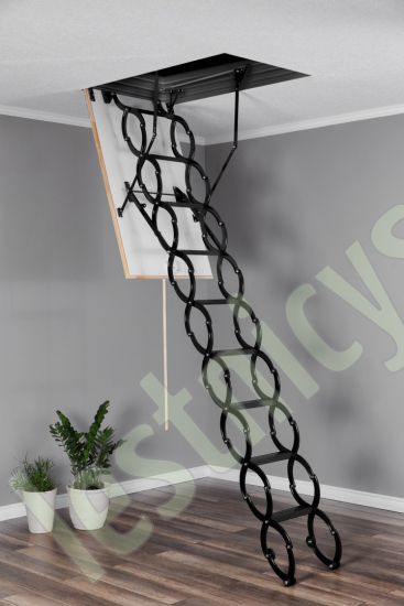 Все элементы лестницы выполнены из экологически чистых материалов и обработаны веществами, не содержащими тяжелых металлов. На ступенях антискользящие насечки. Короб лестницы изготовлен из металла. Термоизоляционная крышка типа "сэндвич" утеплена пенопластом, облицована с двух сторон ДСП белого цвета. Короб люка с уплотнителем. В комплекте деревянный стержень для открывания лестницы.