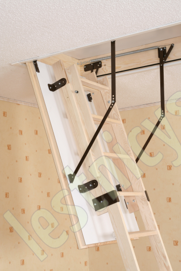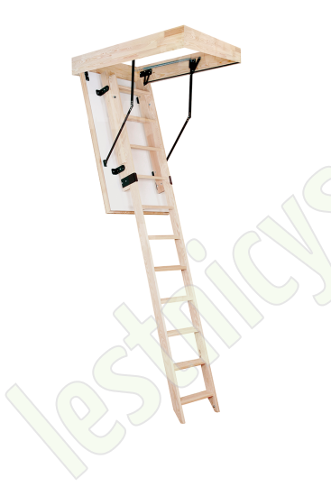 Лестница раздвижная двухсекционная, изготовлена из сосны. Термоизоляционная крышка типа "сэндвич" имеет усиленную теплозащиту, облицована с двух сторон ДСП белого цвета. По контуру короба имеется уплотнитель. Все металлические элементы лестницы покрыты порошковой краской, ступени лестницы имеют антискользящие насечки и закреплены в столярное соединение «ласточкин хвост», что позволяет выдерживать нагрузку 150 кг. При раскладывании лестницы нет вылета за пределы короба, что позволяет использовать эту модель лестницы в таких помещениях, где невозможно использовать чердачные лестницы с большим разбегом открытия. Удобна для эксплуатации на большой высоте. Деревянный стержень для открывания лестницы в комплекте..