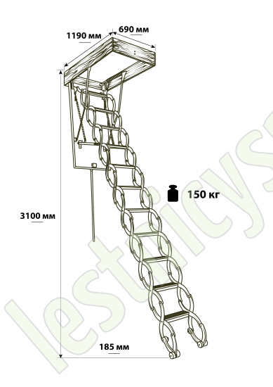 Материалы: корпус и утепленный люк из древесины хвойных пород с теплоизоляцией из пенопласта; ступени и тетивы из металла для максимальной прочности.
