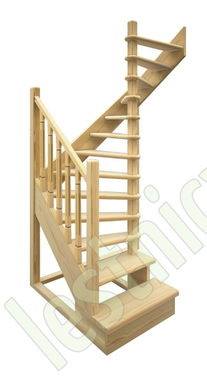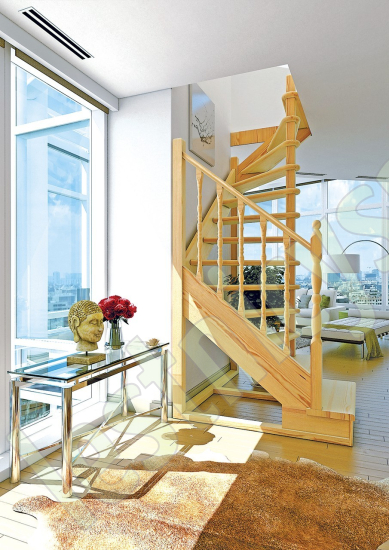 Удобная поворотная лестница на второй этаж. Дополнительные ограждения по первому маршу обеспечивают безопасность при подъеме и спуске, кроме того, небольшой угол подъема открывает всю площадь ступеней. Монтаж осуществляется силами двух человек на объекте по указаниям, приведенным в паспорте на лестницу.