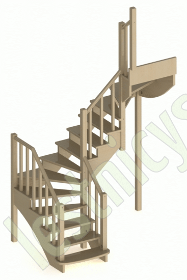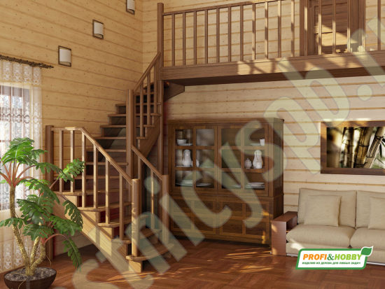 Ступени и поручень лестницы выполнены из бука, остальные элементы из сосны. Возможно изготовление данной модели полностью из бука.