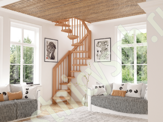 Базовый комплект включает в себя деревянные элементы лестницы и ограждения без какого-либо покрытия. Лестница сверхмалогабаритная