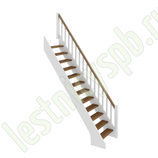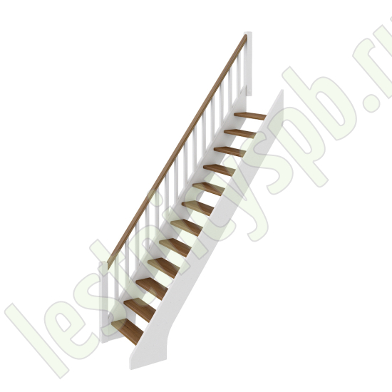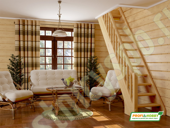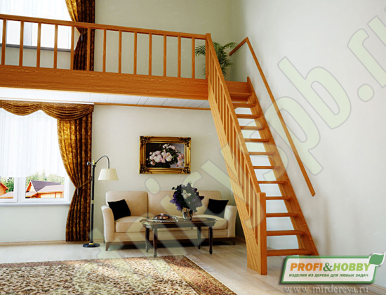 В производстве лестницы ЛС-10м под покраску используется сосна с небольшими изменениями цвета, что практически не влияет на ее механические свойства и почти незаметно при покраске в темные цвета. Базовый комплект включает в себя деревянные элементы лестницы и ограждения без какого-либо покрытия. Ограждение можно установить слева или справа.