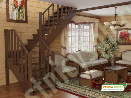 Базовый комплект включает в себя деревянные элементы лестницы и ограждения без какого-либо покрытия.
