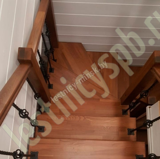 Деревянные элементы: столбы и поручень по умолчанию идут без окрашивания, металлические элементы окрашены в цвет каркаса лестницы. Ограждение начинается с пятой ступени. Комплект предполагает размещение по одной стойке на ступень.