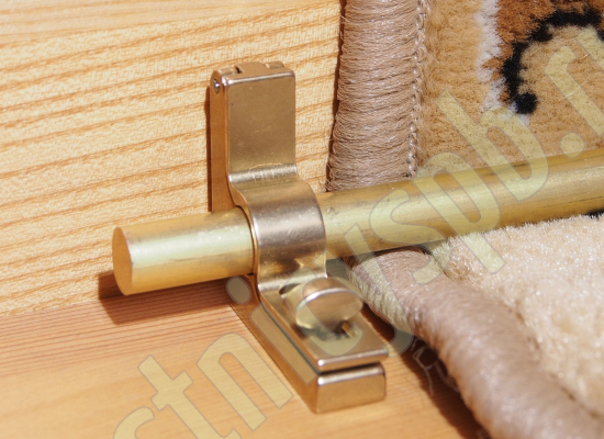 Ковродержатель комплектуется двумя держателями из латуни цвета золото, а также цельным прутком из латуни длиной от 131 до 170 см. Конструкция является сборно-разборной не требующей демонтажа креплений, что делает ее долговечной и очень удобной для чистки ковров и ковровых покрытий.
