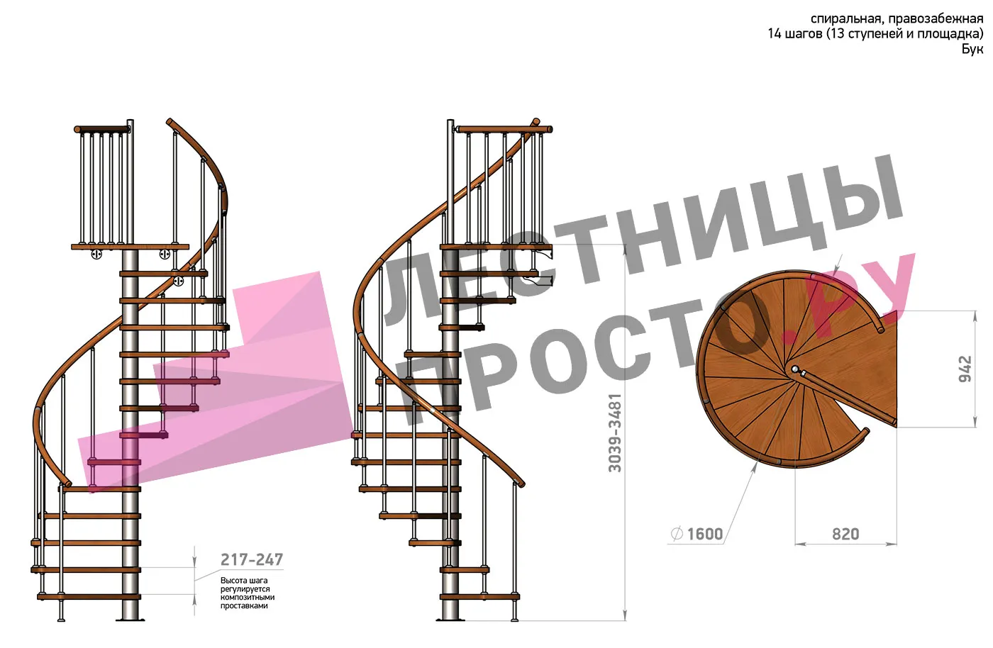 | Винтовая лестница Prosto Spiral White D160см, h282.2-326,3 см, бук |