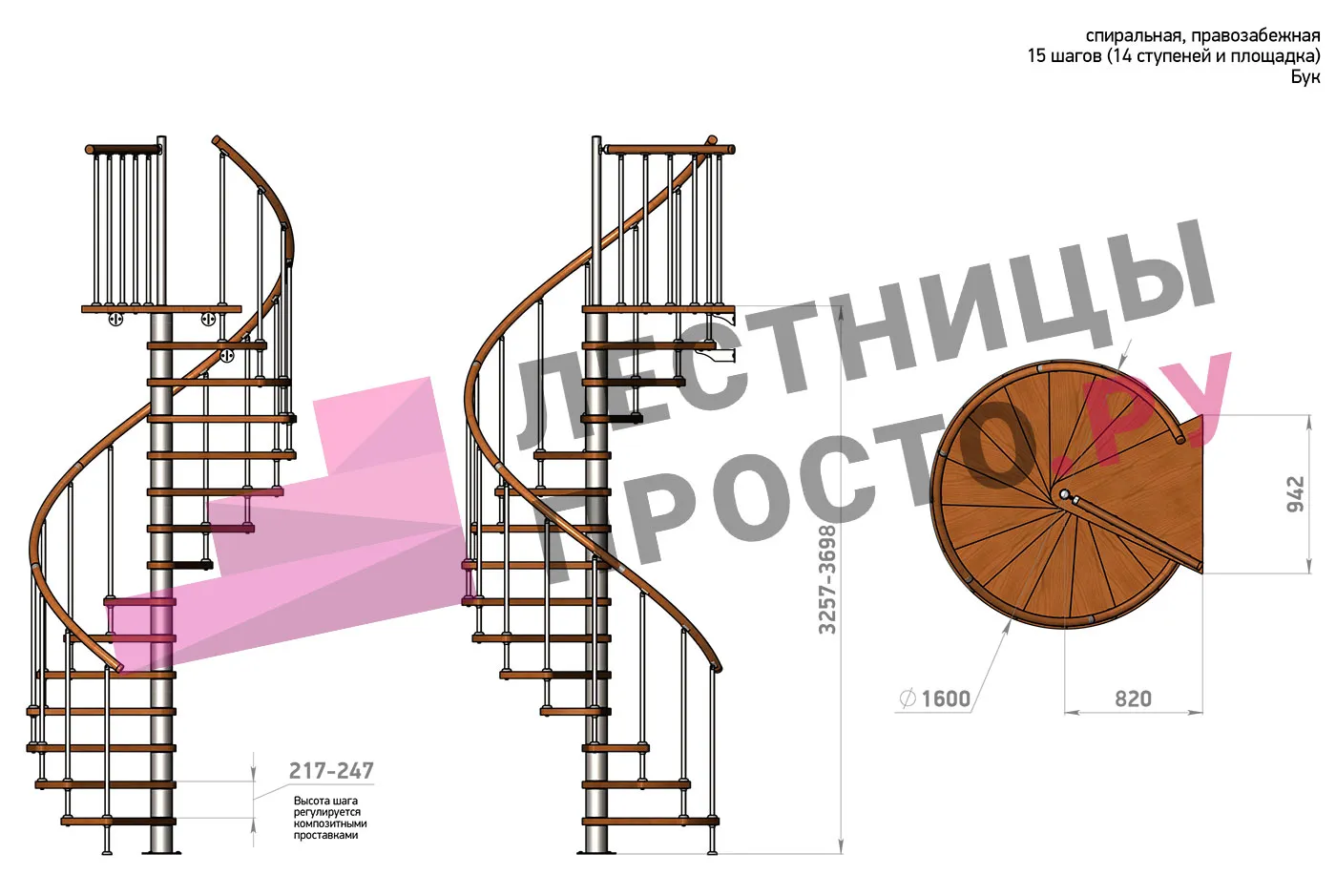 | Винтовая лестница Prosto Spiral White D160см, h325.7-369.8 см, бук |