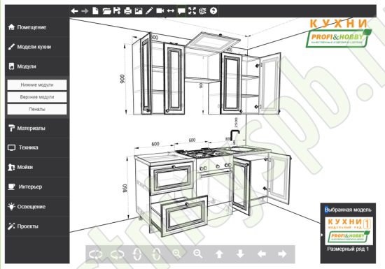 Благодаря модульной системе такая кухня может быть собрана зеркально. В стандартной комплектации нижние тумбы оснащены регулируемыми ножками высотой 100 мм и цоколем из массива сосны 95 мм.