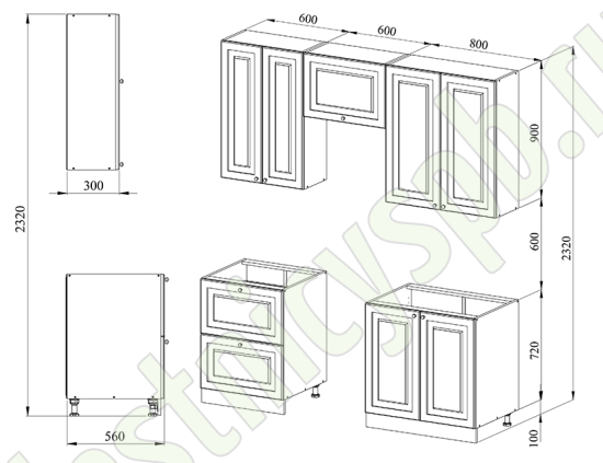 Благодаря модульной системе такая кухня может быть собрана зеркально. В стандартной комплектации нижние тумбы оснащены регулируемыми ножками высотой 100 мм и цоколем из массива сосны 95 мм.