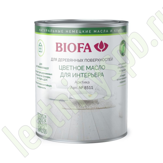 Арктика. Белое укрывистое масло для интерьера (BIOFA Color-Oil For Indoors) - продукт состоящий из высококачественных биомасел и восков. Используется для придания цветового оттенка поверхности древесины и в качестве износостойкого покрытия для мебели, стен, потолков, лестниц и всех видов деревянных напольных покрытий, пробки. Создает устойчивую к образованию пятен, прочную и износостойкую поверхность. Обладает антистатическим эффектом. Придаёт поверхности водо – и грязеотталкивающие свойства, легкость в уходе. Продукт прост в применении и легко наноситься кистью, валиком или тканью.