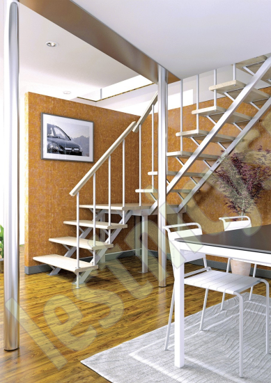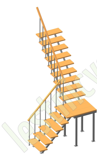 Универсальная лестница на металлическом каркасе с поворотной площадкой. Идеально дополнит любой интерьер, имеет современный вид и удобна в использовании. Монтаж осуществляется силами двух человек на объекте по указаниям, приведенным в паспорте на лестницу.