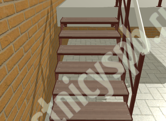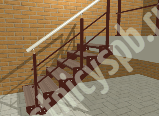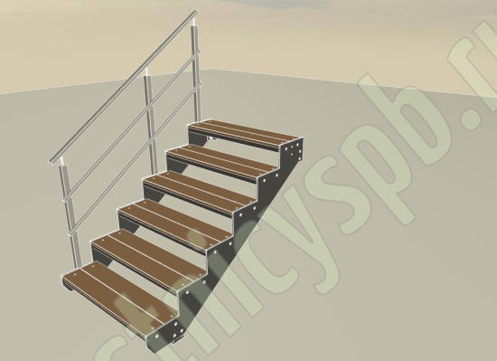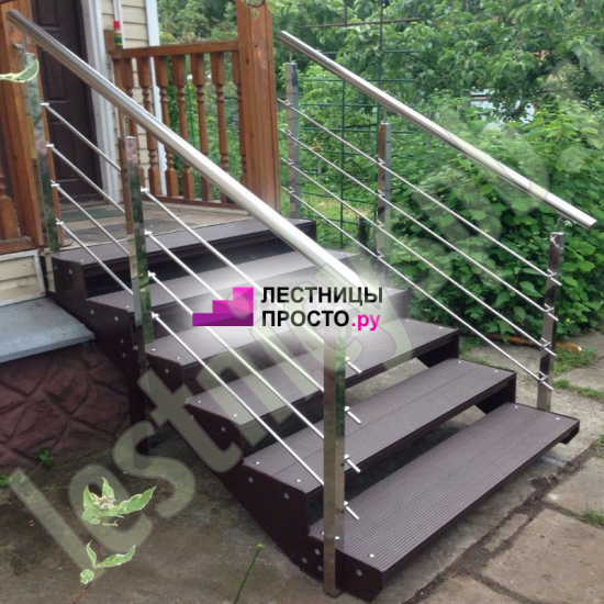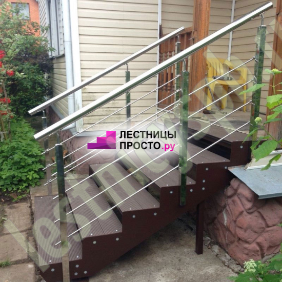 Покрытие порошковое, очень прочное и долговечное. Все детали каркаса крепятся с помощью болтов, благодаря чему Вы можете собрать каркас самостоятельно без применения сварки. В зависимости от ширины лестницы, каркас состоит из двух (ширина до 1 метра) или трех (ширина до 2 метров) опорных балок (тетив). Ступени лестницы состоят из металлической рамки, обеспечивающей необходимую прочность, и покрытия из террасной доски ДПК (древесно-полимерный композит). Ступени не боятся воды и мороза, не теряют со временем свой внешний вид и не требуют ухода. Нержавеющая сталь, которую мы используем для ограждений на улице - неприхотлива в обслуживании, выглядит стильно и прекрасно выдерживает капризы погоды
