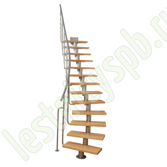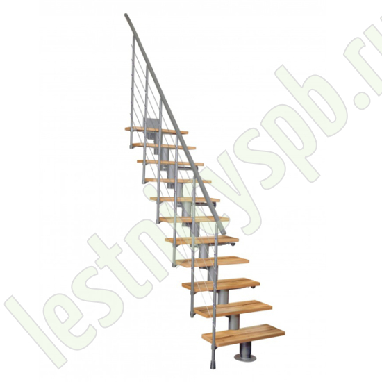 Лестница на стальном модульном каркасе. Высота лестницы регулируется при сборке засчет регулировки высоты шага. Ступени покрыты защитным лаком. Ограждение из стали с пластиковым поручнем. В комплект входят перила с вертикальными стойками и горизонтальными перегородками. Изделие поставляется с шурупами (кроме потолочных и напольных анкеров), инструкциями по монтажу и эксплуатации и гарантией. Внимание! Для этой лестницы необходимо крепление к стене.