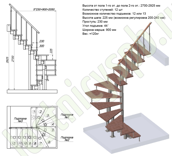 Высота лестницы 2700 - 2925 (12 ступеней) мм