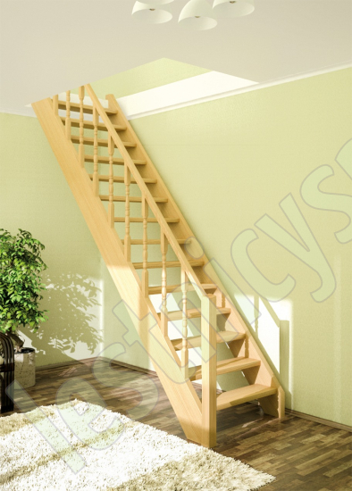 Базовый комплект включает в себя деревянные элементы лестницы и ограждения без какого-либо покрытия. Ограждение монтируется с любой стороны. Дополнительно к этой лестнице можно установить пристенные поручни ( в базовый комплект не входят)