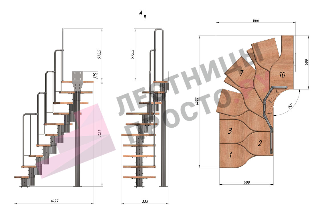 Высота лестницы 1800 - 2640 (10 ступеней) мм