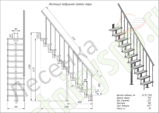 Модульная малогабаритная лестница Линия 2475-2700, Серый, Сосна, Нержавеющая сталь