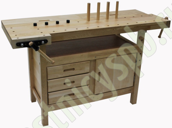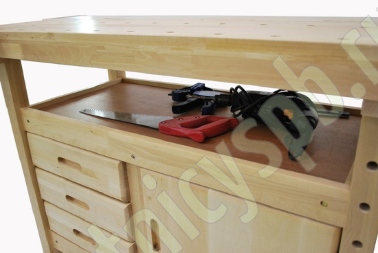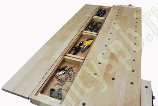 Комплектация: 2 комплекта тисков, 2 пенала в столешнице, 3 ящика, 1 шкафчик, полка
