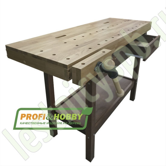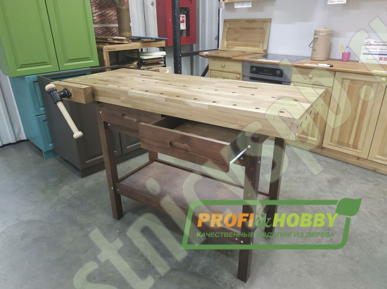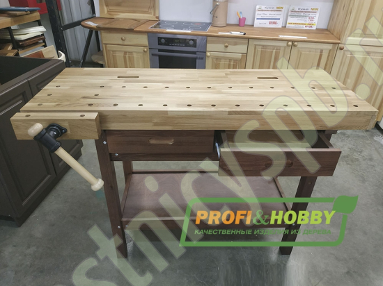 Комплектация: 1 тиски, 2 пенала в столешнице, 2 выдвижных ящика, полка для инструментов.