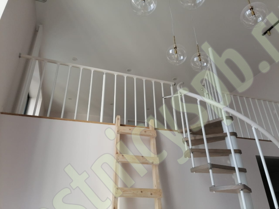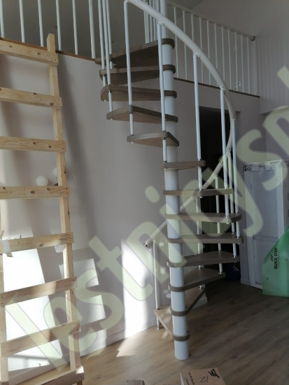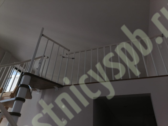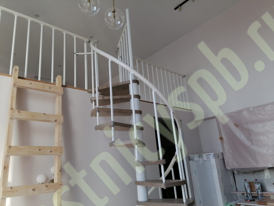 Лаконичная малогабаритная стильная винтовая модульная лестница с белым каркасом.