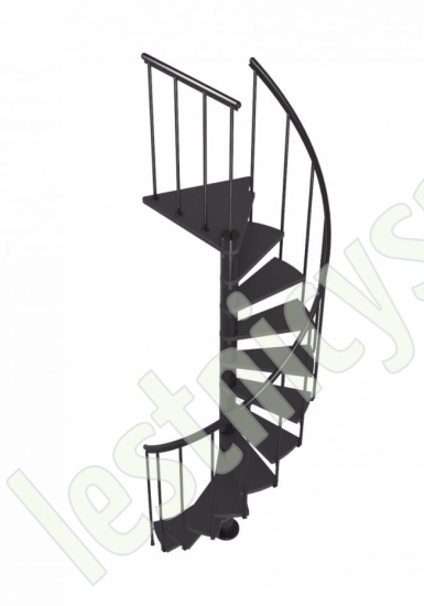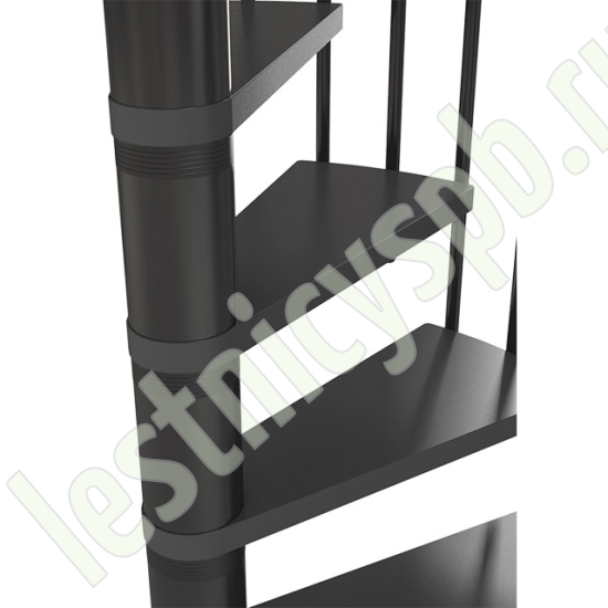 Ступени лестницы изготовлены из бука по технологии MULTIPLEX и покрыты износостойким защитным лаком. Лестница монтируется как по часовой стрелке, так и против. Возможен монтаж в круглый или квадратный проём. Ограждение: стальные трубки, Ø25 мм RAL 7016. Поручень: гибкий цельный ПВХ-поручень Ø40 мм антрацитового цвета. Конструкция и балюстрада окрашены порошковым способом в антрацитовый цвет (RAL 7016).