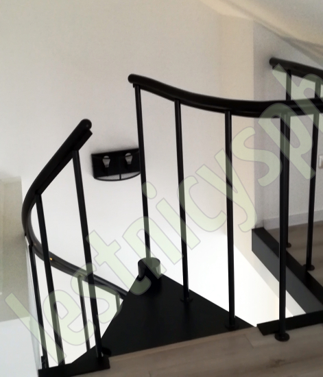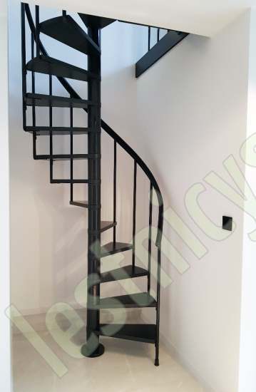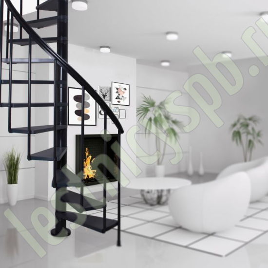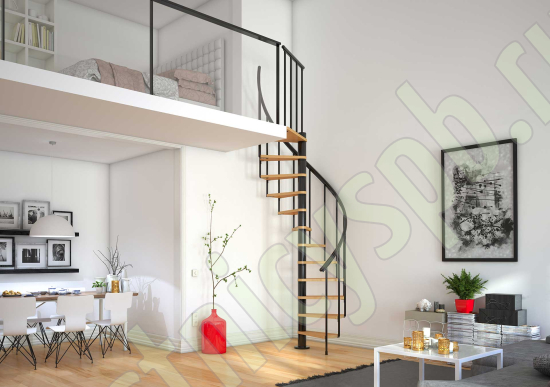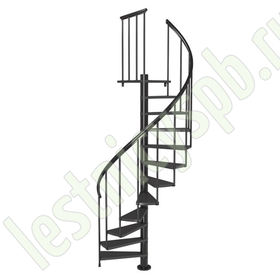 Ступени лестницы изготовлены из бука по технологии MULTIPLEX и покрыты износостойким защитным лаком. Лестница монтируется как по часовой стрелке, так и против. Возможен монтаж в круглый или квадратный проём. Ограждение: стальные трубки, Ø25 мм RAL 7016. Поручень: гибкий цельный ПВХ-поручень Ø40 мм антрацитового цвета. Конструкция и балюстрада окрашены порошковым способом в антрацитовый цвет (RAL 7016).
