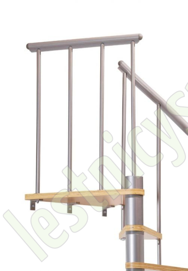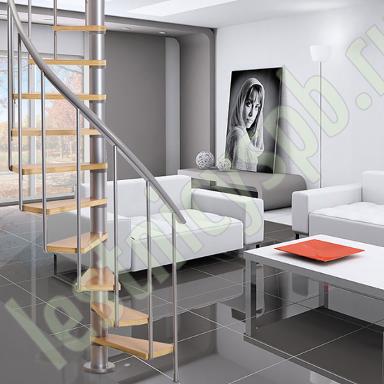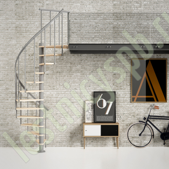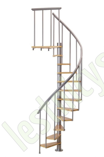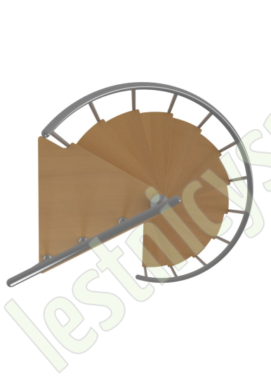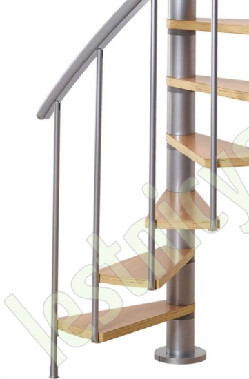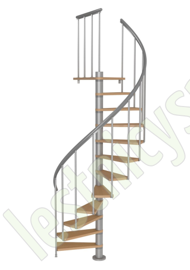 Ступени лестницы изготовлены из бука по технологии MULTIPLEX и покрыты износостойким защитным лаком. Лестница монтируется как по часовой стрелке, так и против. Возможен монтаж в круглый или квадратный проём. Ограждение: стальные трубки, Ø25 мм RAL 9006. Поручень: гибкий цельный ПВХ-поручень Ø40 мм серого цвета. Конструкция и балюстрада окрашены порошковым способом в серый цвет (RAL 9006).