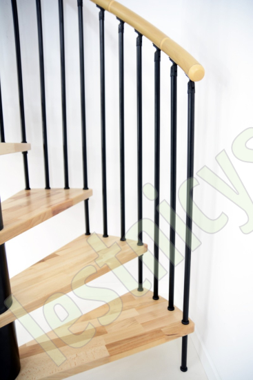 Поручень лестницы изготовлен из массива дуба в тон ступеням. Ступени и поручень покрыты износостойким защитным лаком.